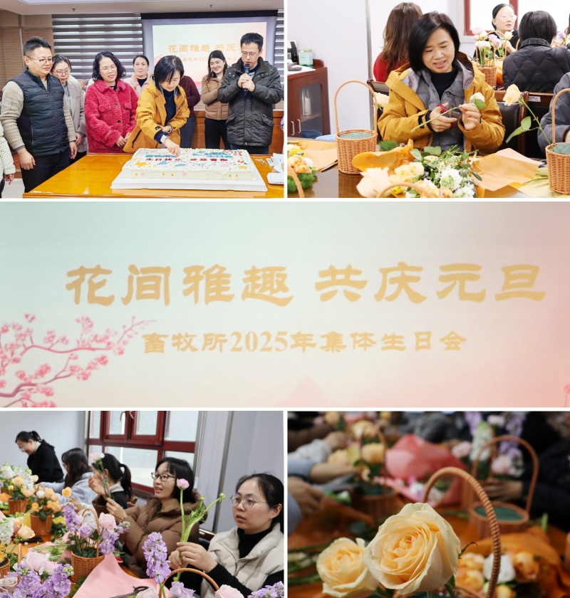 为深化人文关怀理念,有效缓解职工工作压力,进一步凝聚团队向心力、提升职工幸福感与归属感,12月31日下午,畜牧所党总支部、分工会、团支部携手综合办公室,联合打造了一场主题为“花间雅趣・共庆生辰”的2025年集体生日会。全所职工欢聚一堂,在温馨祥和的氛围中共迎新年曙光,同庆生辰喜悦。