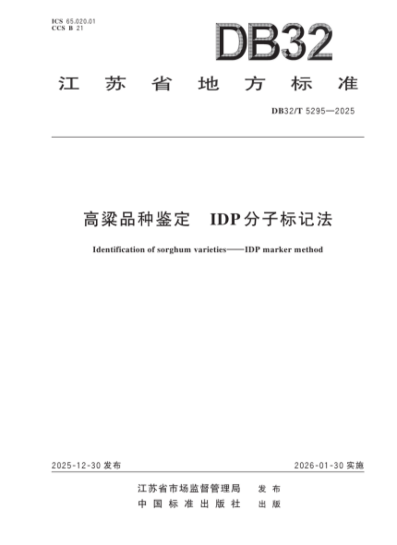 近日,江苏省市场监督管理局发布2025年第13号公告(总第240号),正式批准发布江苏省地方标准《高粱品种鉴定 IDP分子标记法》(标准编号:DB32/T 5295-2025)。该标准由江苏省农业科学院畜牧研究所草遗传育种与生态应用创新团队首席钟小仙研究员、团队成员薛文韬博士主持研制,联合中国农业科学院、贵州省旱粮研究所共同完成,将于2026年1月30日起正式实施。